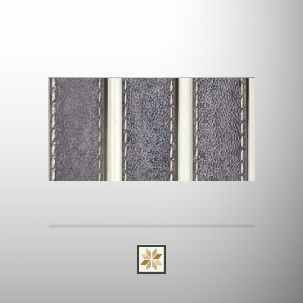 Grey Leather Effect wood louvers/panel offering a sophisticated leather-look finish in a neutral grey. Part of the Leather Effect series, this indoor panel measures 8 ft x 7 inch (display size 8x0.58 feet) with a robust 12 mm thickness and is supplied per piece. Designed for both residential & commercial interiors, it features a 3/4th edge profile for flush, seamless joints and a White Bottom dual-tone detail that adds depth and contrast to installations.