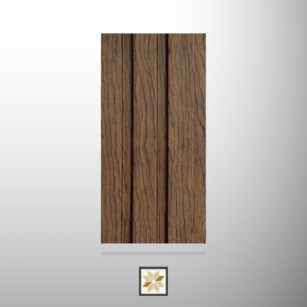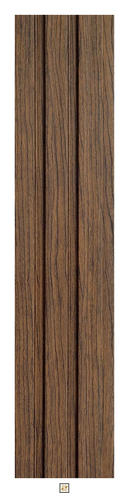 Europratik Wooden Effect Louvers Panel manufactured in Korea. Available in standard 8 ft x 4.7 in (8x0.39 ft) size and other formats (8x4, 8x5, 8x7, 8x8) with thickness choices of 10 mm, 12 mm and 15 mm. Offered in Classic, Platinum and Premium grades across 120+ designs and finishes including leather, stone, marble and wood. Lightweight, water-resistant and protected against termites and borers. Finished in brown wood-look; edge profile 3/4th with a uniform dual-tone design. Pack quantity: 1 piece. Ideal for both indoor and outdoor applications in residential and commercial projects.