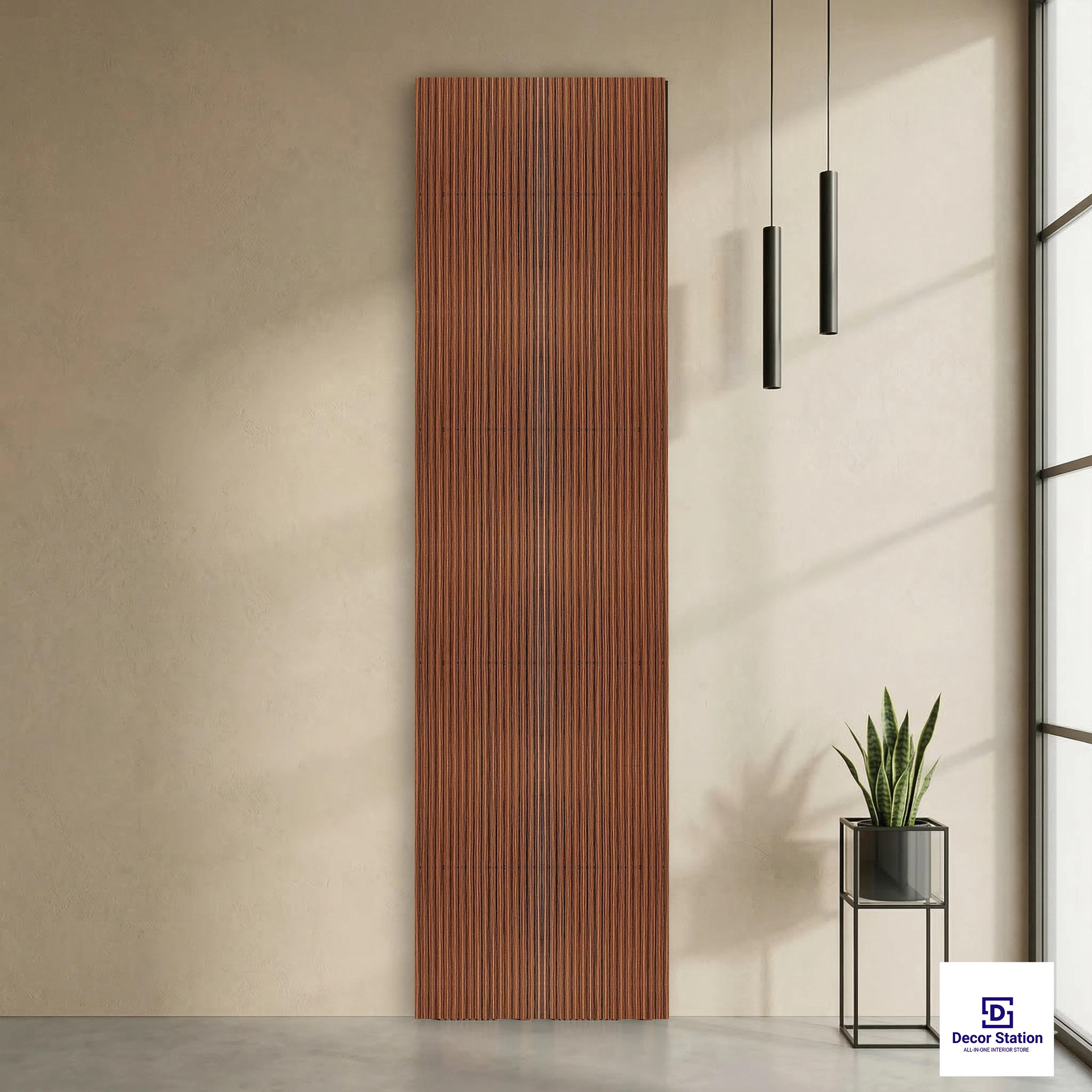 The MN-9616 Brown Wood Fluted Wall Panel features a sleek look with vertical fluted design and a natural wood texture that gives you a cozy look in any room with its medium brown color and wood grain texture. The MN-9616 Brown Wood Fluted Wall Panel stands tall at 9.5 feet in height and 0.52 feet in width, making it perfect for a wall-to-wall look. At 6mm in thickness, it is lightweight without compromising on its durability. Highlights: - Vertical fluted design - Natural brown wood texture - Honey-brown color - Matte finish - Lightweight - Easy to install - Water-resistant - Stain-resistant - Termite-resistant - Borer-resistant - Long-lasting Usecases: - Living room feature walls - Bedroom headboard backdrop panels - TV backdrop walls - Office cabin walls - Reception areas - Retail interiors