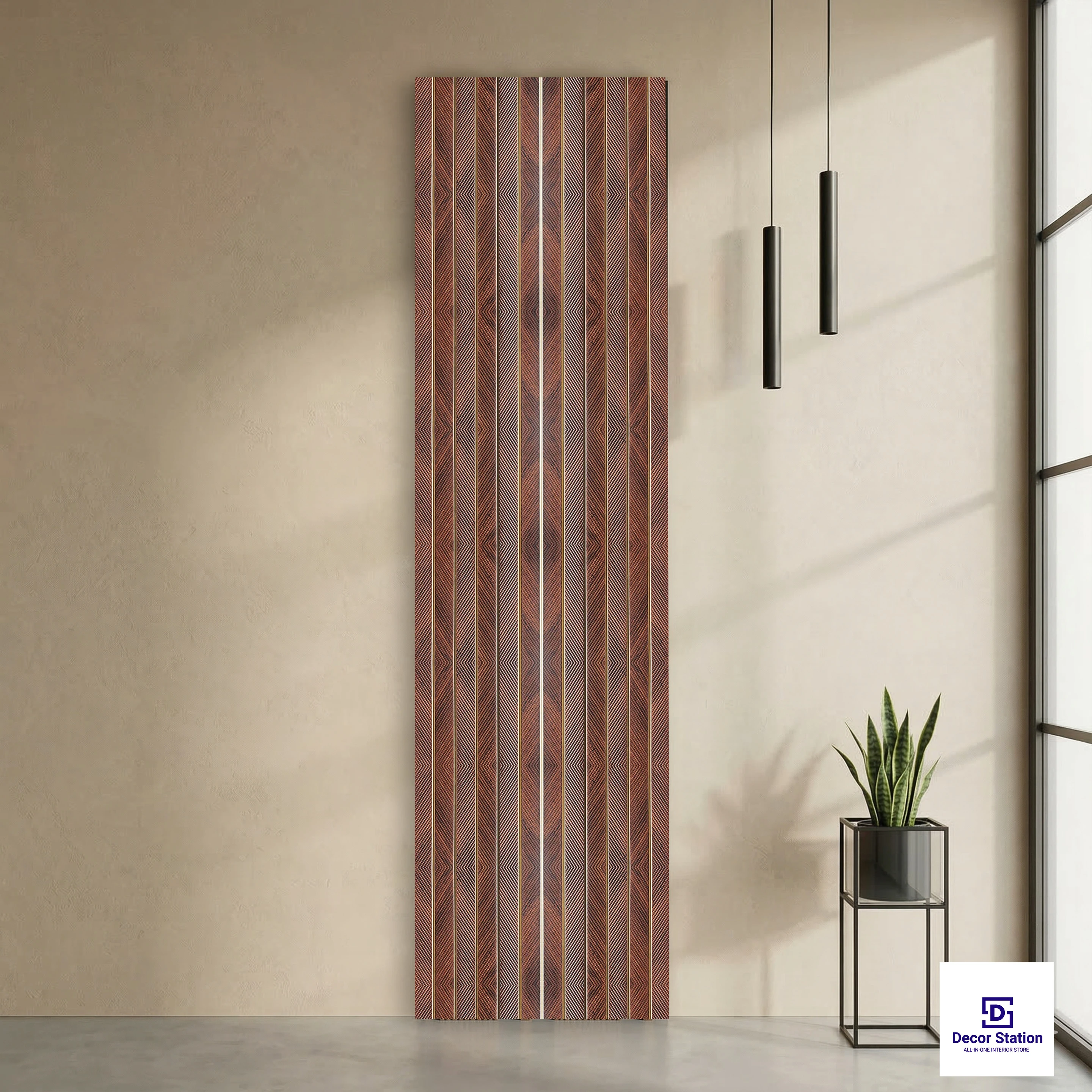 MN-9803 Wood Finish Brown Texture Wall Panel is a premium fluted decorative panel that combines the warmth of brown wood tones with a high-quality textured finish. Additional details of slim vertical lines and subtle diagonal lines enhance the design, providing depth, warmth, and a high-quality architectural look to any interior space. With a large 9.5 ft x 0.66 ft (2900 x 200 mm) profile and a strong 8mm thickness, the product provides lightweight strength and long-lasting performance. The wide plank profile also provides faster wall coverage, making the product ideal for dramatic and elegant feature wall applications.