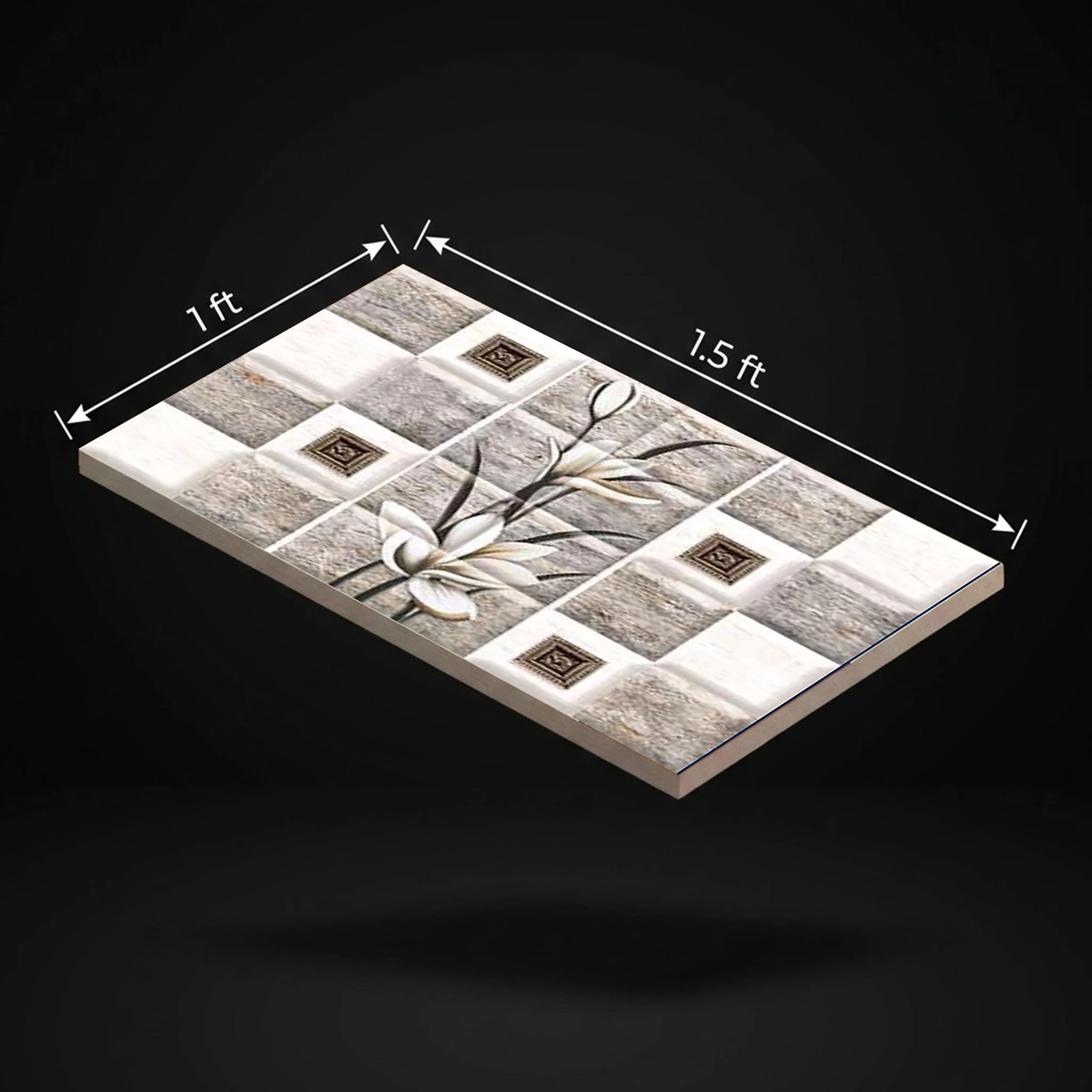 5535 HL-1 glossy wall tile is a decorative tile with a glossy finish and a refined decorative design. The tile has a combination of a textured block design with a beautiful floral centerpiece. The tile is available in a combination of beige and gray colors with a touch of small squares. The tile is a perfect choice for interior decoration and has a modern look. It is a perfect choice for feature walls and decorative areas. The tile is made of a strong ceramic material and has a glossy finish. It is a perfect choice for interior decoration and is available in a rectangular shape with dimensions 300 x 450 mm (1 x 1.5 ft) and a standard wall tile thickness. It is a perfect choice for interior decoration and is available for residential and commercial use.