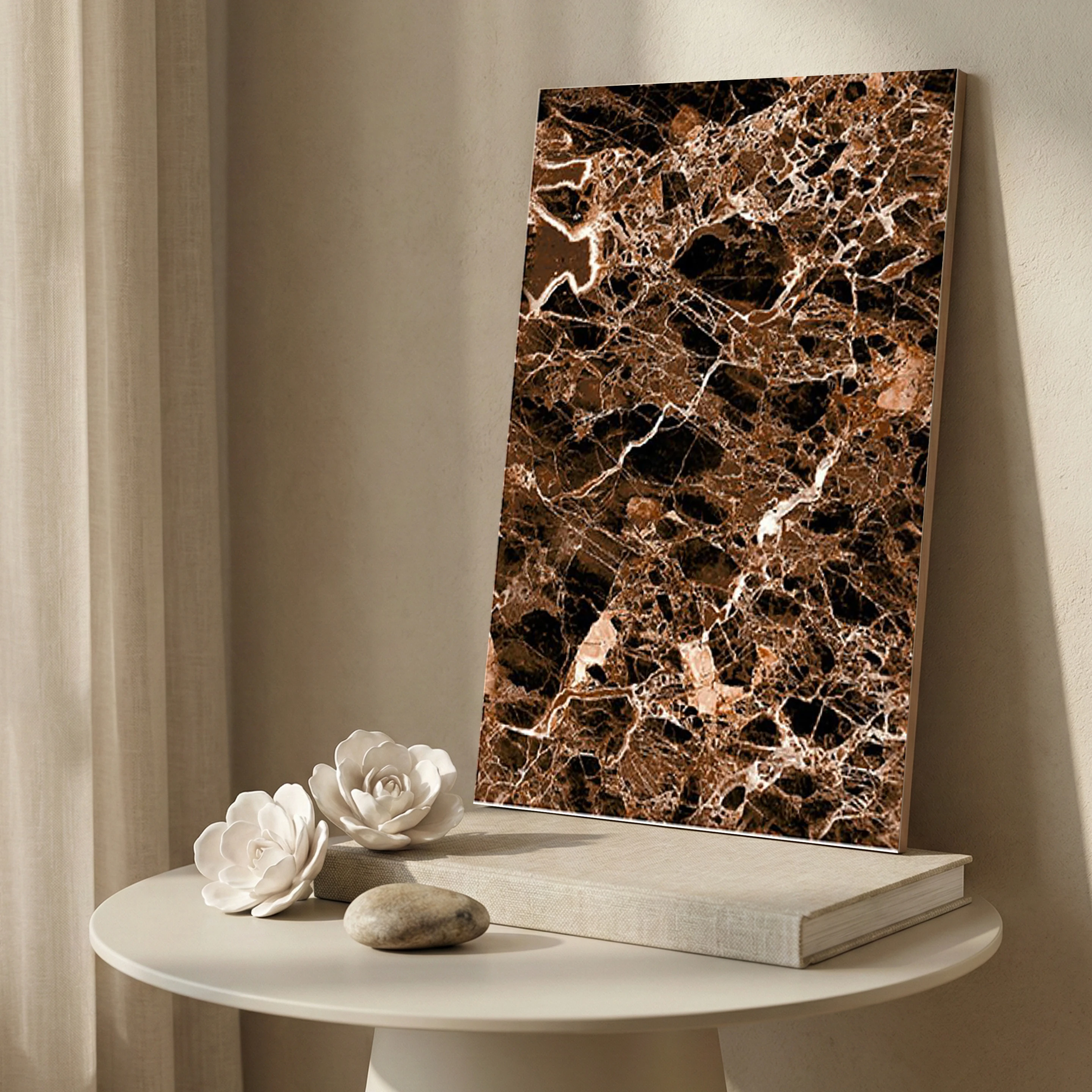 The 9305-D Marble Look High Gloss Tile combines the luxurious look of marble with the brightness of high gloss and the durability of ceramic. The tile features a warm brown marble look that adds elegance and luxury to indoor walls. The tile is made of high-quality ceramic, ensuring durability and easy maintenance. The high gloss finish makes the tile shine and reflects light, making the marble details, created by digital printing, stand out. The tile measures 1x1.5 ft (300x450mm) with a thickness of 8mm and is flat and rectangular in shape, ideal for wall installations. The tile comes in a pack of 6 and is strictly for indoor wall use.
