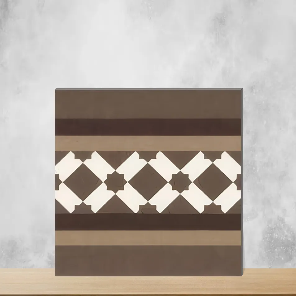 Details: Border 300 x 300 mm (12x12 inch) ceramic floor tile from the Morrocans series featuring a matte finish and Moroccan digital carpet look. At 9.5 mm thickness this brown border tile delivers durable performance for regular foot traffic while retaining an authentic carpet-like Moroccan pattern. Designed as a decorative border tile for floors in residential & commercial projects; pack quantity is 11 pieces. Highlights: - Ceramic construction with robust 9.5 mm thickness for long-lasting floor applications - Matte, non-reflective Moroccan design that mimics a digital carpet look - Standard 300 x 300 mm (12x12 inch) size for straightforward installation and border detailing - Brown color palette that complements indoor and outdoor schemes - Ideal as a floor border tile for balconies, parking, living rooms, and offices - Series: Morrocans — suitable for both residential and commercial projects Usecases: - Decorative floor borders on balconies, terraces and outdoor walkways (Outdoor) - Accent border and transition tiles in living rooms and interior corridors (Residential) - Durable border detailing for office layouts and commercial flooring areas (Commercial) - Edge treatment and aesthetic borders for parking bays and pedestrian zones (Parking, Floor, Tiles, Border, Moroccan, Matte, Ceramic)