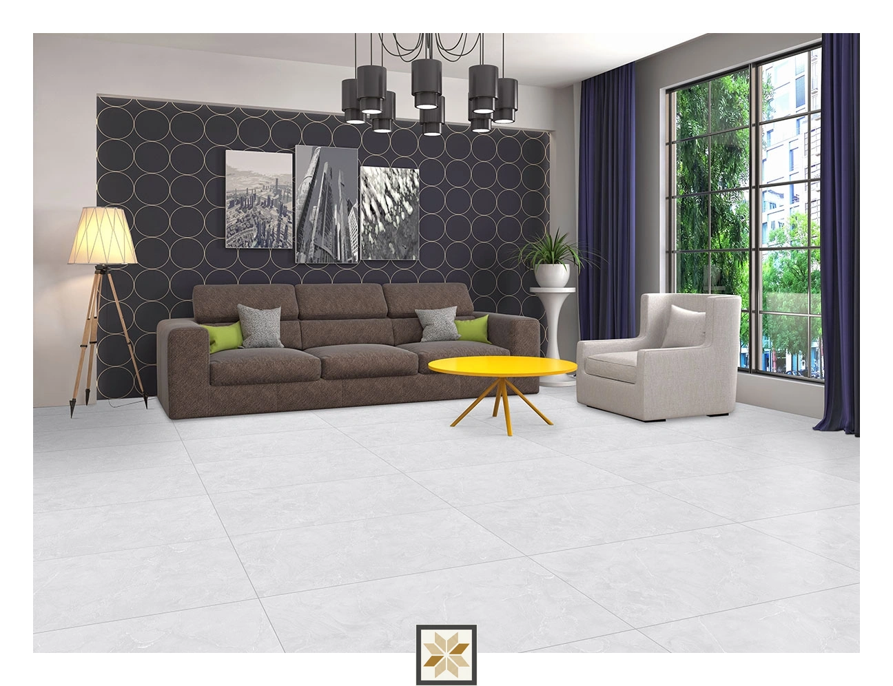- Living room: expansive, continuous marble-like flooring to elevate interiors