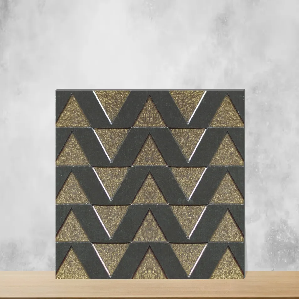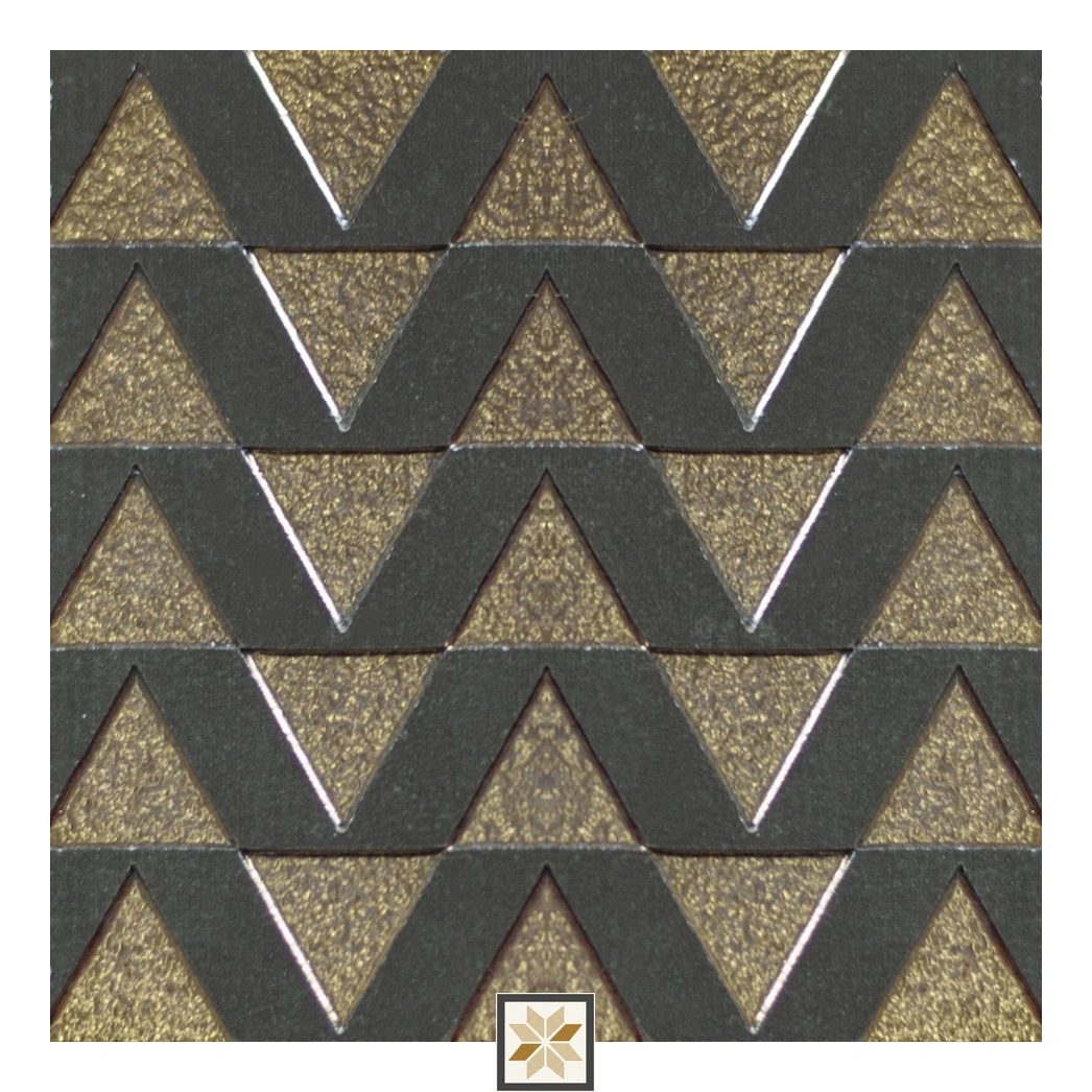 Details: Metallic wall tile featuring a Chevron-layer Opulent Metal look in a rich Gold finish. Each square vitrified tile measures 96 mm x 96 mm (4x4 inch) with a durable 9 mm thickness, offered in 8 random patterns to create dynamic wall compositions. Designed for indoor use across residential & commercial projects, these wall tiles come in packs of 12 pieces and combine the striking metallic appearance with the durability and low porosity of a vitrified base. Highlights: - Opulent Metal metallic look with Chevron layer texture for a premium visual statement - Compact 96 mm x 96 mm (4x4 inch) square format and 9 mm thickness for easy handling and installation - Vitrified base ensures long-lasting performance, resistance to stains and low maintenance - Available in 8 random patterns to deliver varied layouts and design flexibility - Elegant Gold color ideal for accent walls, feature panels and decorative finishes - Suitable for both Residential & Commercial indoor settings; sold in packs of 12 pieces Usecases: Ideal for Living Room feature walls, Bedroom accent panels, Kitchen backsplashes, Bathroom wall applications, Dining area highlights and Office reception or feature zones. Well-suited wherever a metallic, chevron-style aesthetic and durable vitrified wall tile are desired.