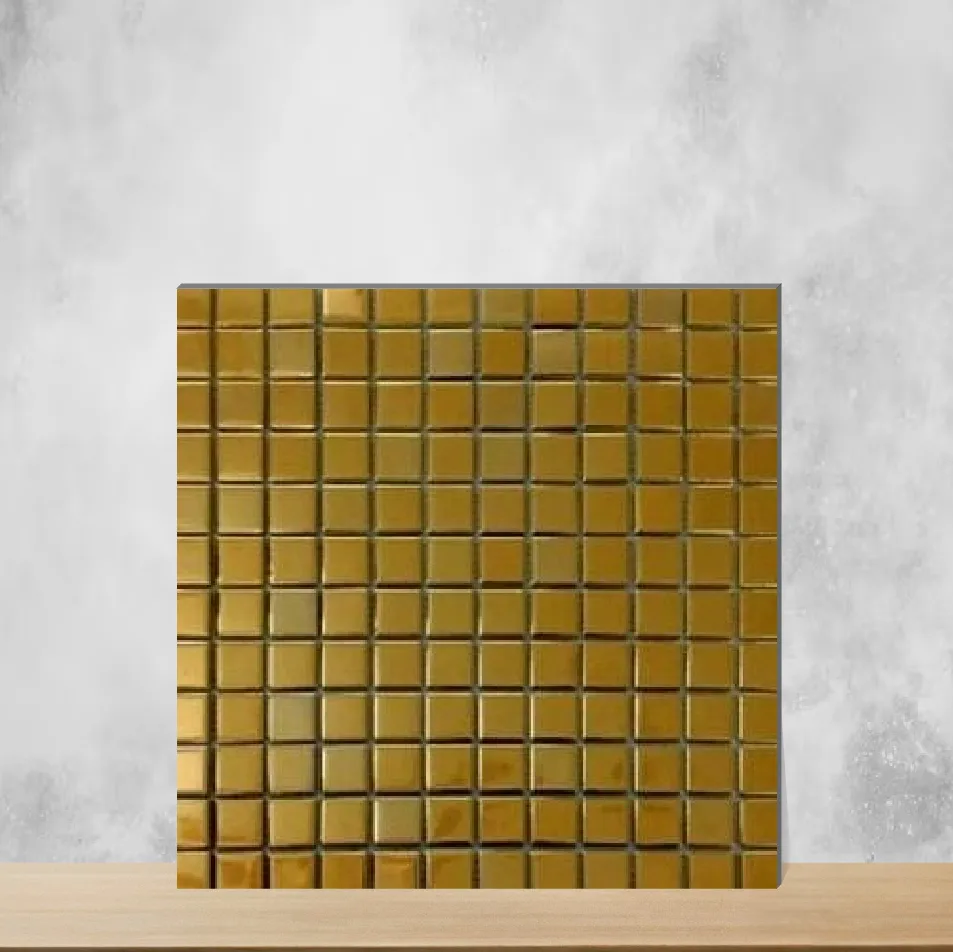 Details: Gold 300 x 300 mm matte finish glass mosaic tile with chip size 23 x 23 mm. Each panel measures 12x12 inch (300 x 300 mm) with a 9 mm thickness, supplied in packs of 22 pieces. This glass mosaic offers a rich gold color and a refined mosaic look designed primarily for wall surfaces. Engineered for both residential & commercial projects and suitable for indoor and outdoor installations. Highlights: - Premium gold glass mosaic tile with matte finish for subtle, elegant sheen - Small 23 x 23 mm chip size for detailed mosaic patterns - Standard 300 x 300 mm (12x12 inch) panel format for easy layout - Durable 9 mm thickness for long-lasting installations - Pack quantity: 22 pieces per pack for efficient coverage - Ideal for wall applications; easy to cut and install - Suitable for both indoor and outdoor environments Usecases: - Kitchen backsplashes and accent walls to add a gold mosaic focal point - Bathroom walls, shower surrounds, and vanity backsplashes for a luxe look - Living room feature walls, fireplace surrounds and decorative panels - Commercial installations such as hotel lobbies, retail displays, and reception areas - Decorative indoor/outdoor accents, pool surrounds and feature strips where a gold glass mosaic is desired