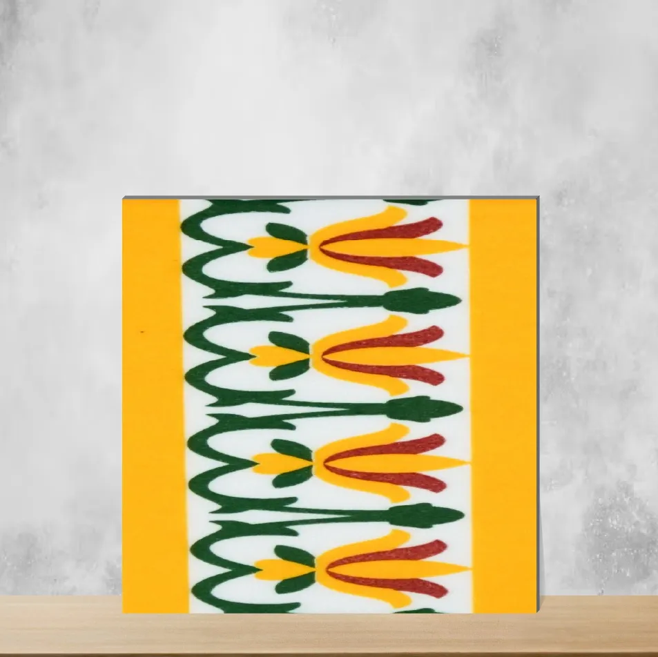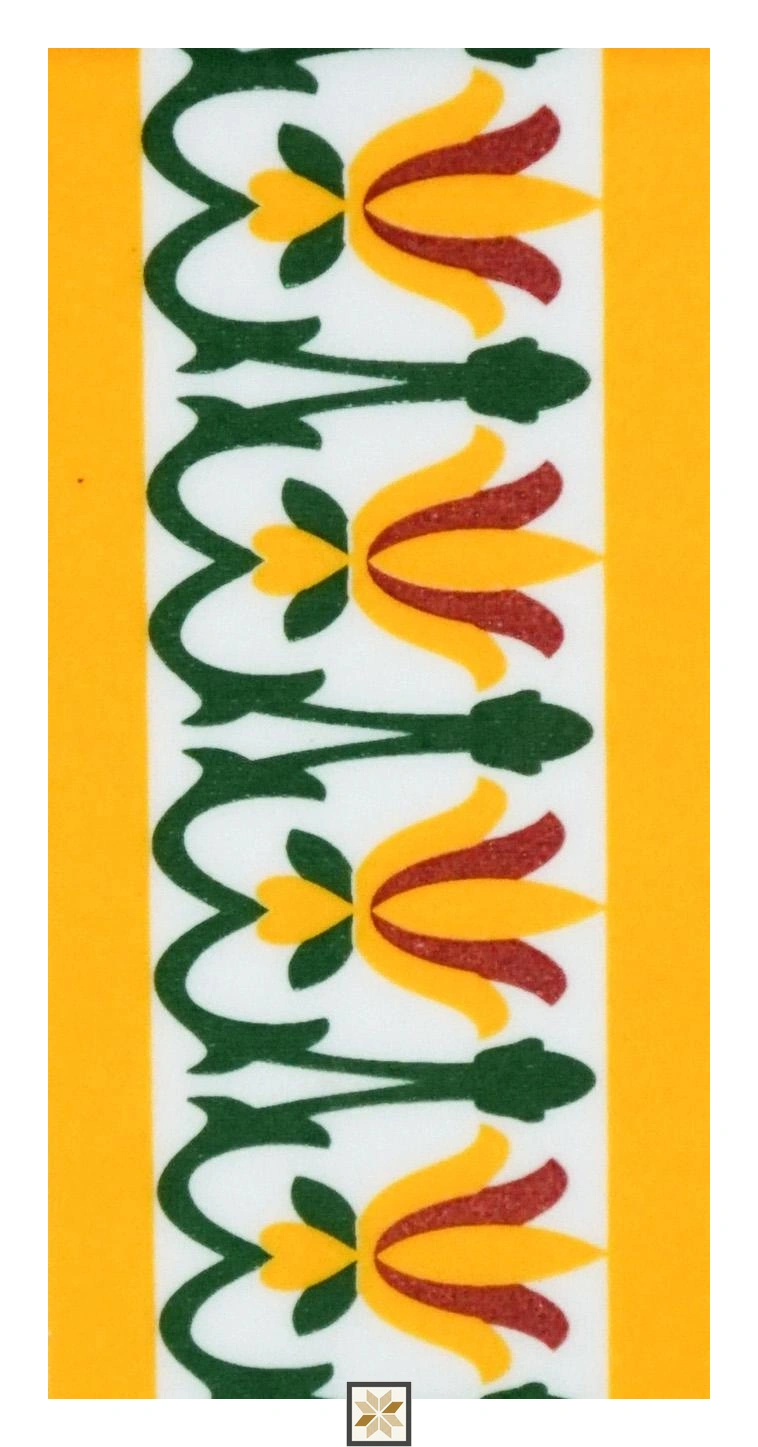 Details: Florica Canary Charm yellow border piece showcases traditional Athangudi floral and rangoli motifs, handcrafted in ceramic with a glossy finish. Each tile measures 3x6 inch and is 7 mm thick, designed primarily for vertical surfaces to bring vibrant Indian heritage charm to interiors. Highlights: - Handcrafted ceramic construction with glossy finish - Detailed floral and rangoli Athangudi patterns - 3x6 inch size with 7 mm thickness, wall-use only - Easy to clean and install; complements Moroccan-inspired and contemporary decor Usecases: Perfect for kitchen backsplashes, bathroom backsplashes and basin accent walls, stair risers, furniture accents and balcony accent walls to add color, texture and artisanal character.