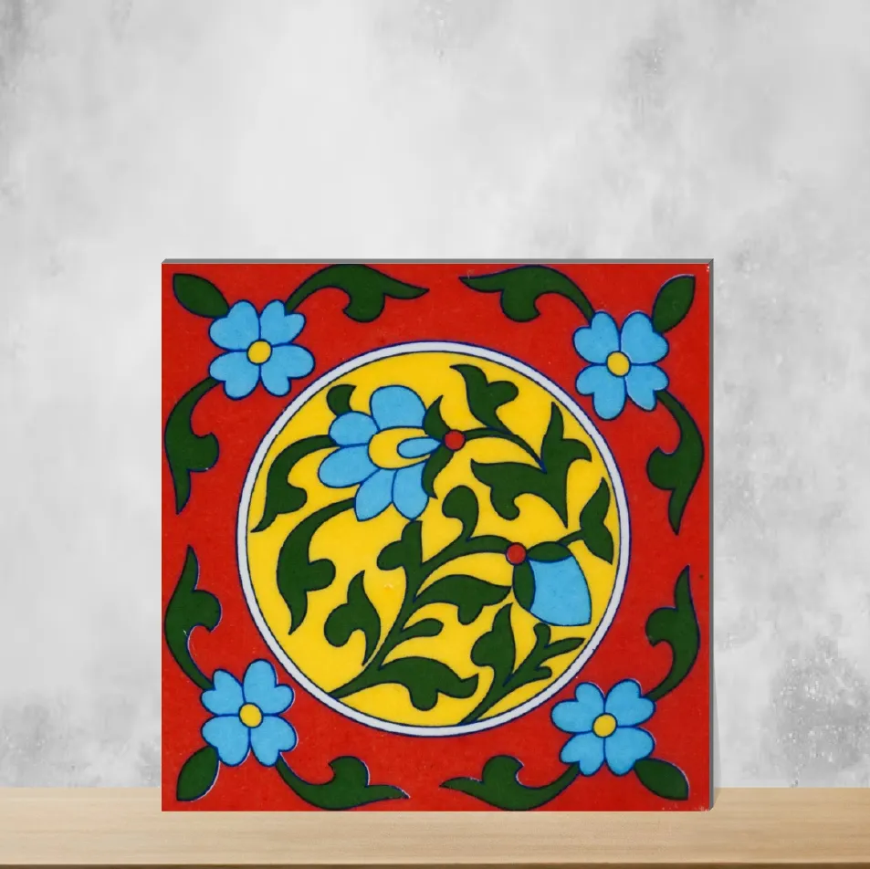 Details: Handcrafted Florica "Crimson Fleur" ceramic wall tile inspired by Athangudi motifs, featuring vibrant floral and rangoli patterns. Produced as 6x6 inch ceramic units with a glossy finish and 7 mm thickness, these tiles bring authentic traditional Indian charm to indoor vertical surfaces. Highlights: - Handcrafted Athangudi-style floral & rangoli designs for rich visual detail - Glossy ceramic finish enhances color and is easy to clean - 7 mm thickness provides reliable wall performance - Designed for wall use; sold in packs of 10 pieces for convenient installation Usecases: - Kitchen backsplashes to introduce a colorful heritage accent - Bathroom backsplashes, basin feature walls and accent panels - Stair risers or furniture surfaces for decorative statements - Any indoor vertical surface (balcony, walls, accents) to showcase traditional Indian craftsmanship