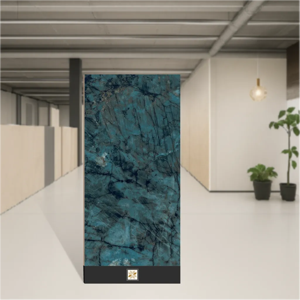 Details: Marble-look wall tile in the Labradorite Jade design, crafted from durable vitrified material with a high-gloss finish. This large-format rectangular tile measures 4 ft x 2 ft (1200 x 600 mm) and is 9 mm thick. Each pack contains 2 pieces and the range offers 8 random patterns to create a natural, varied marble effect in a blue palette. Designed for both residential and commercial use, it suits interior rooms and exterior elevations where a premium marble appearance is desired. Highlights: - Marble look: realistic Labradorite Jade veining and blue tones - Vitrified body for strength, low porosity and easy maintenance - High gloss finish for a polished, reflective surface - Large-format 4x2 ft tiles (1200 x 600 mm) for fewer grout lines - 9 mm thickness offering a sturdy wall solution - Available in 8 random designs for natural variation - Pack quantity: 2 pieces per pack - Rectangular shape, ideal for wall cladding in varied settings Usecases: - Living room feature walls and TV backdrops - Bedroom accent walls and headboards - Bathroom walls and shower surrounds - Kitchen backsplashes and pantry walls - Office reception areas and meeting rooms - Dining areas and restaurant interiors - Exterior elevation accents and facades - Retail spaces, showrooms and hospitality projects