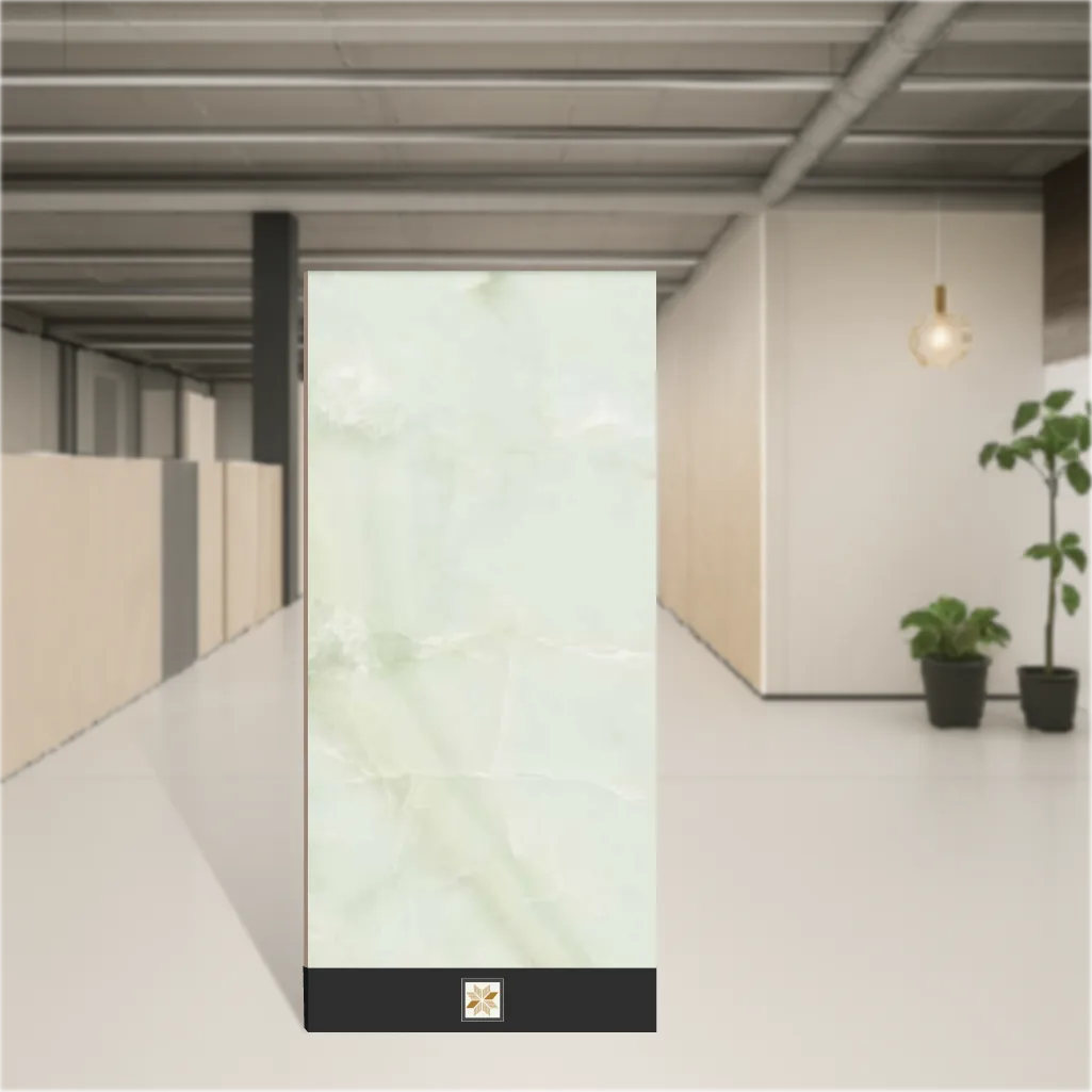 Details: Pear Onyx 1200x600 mm (4x2 feet) glossy finish polished glazed vitrified tile with a marble-look green appearance. This PGVT vitrified tile is 9 mm thick, designed for both floor and wall use in residential & commercial projects. Pack quantity: 2 pieces. Ideal for Marbles & Stones collections where a green marble aesthetic and high-gloss finish are required. Highlights: - Polished glazed vitrified (PGVT) tile with realistic marble look and Green color - Large-format 1200x600 mm (4 ft x 2 ft) reduces grout lines for a seamless floor or wall - Durable 9 mm thickness suitable for heavy foot traffic in commercial and residential settings - Glossy, easy-to-clean surface that resists stains and maintains shine - Versatile for indoor & outdoor use on floors and walls; compatible with modern and classic interiors Usecases: - Luxurious flooring for living room, bedroom, dining areas and office spaces - Feature walls and bathroom cladding that require a marble effect and glossy finish - Commercial flooring in lobbies, showrooms and retail spaces needing durable vitrified tiles - Residential applications where a green marble-look tile enhances aesthetic continuity (floor and wall)