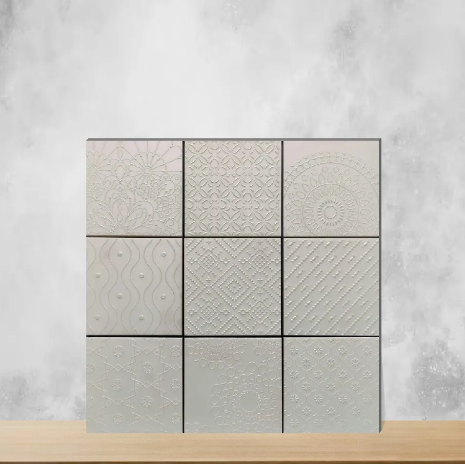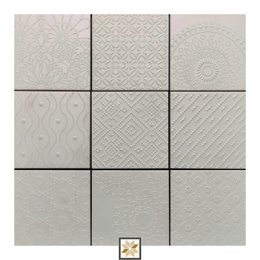 Geometric & Abstract Spactra vitrified wall and floor tile, handcrafted in white. Measures 96 mm x 96 mm (4x4 inch) with a sturdy 9 mm thickness. Square-shaped with a random design — no fixed pattern — making each piece unique. Designed for indoor residential and commercial use, the vitrified base offers high strength, low porosity and easy maintenance. Sold as 1 piece per pack.