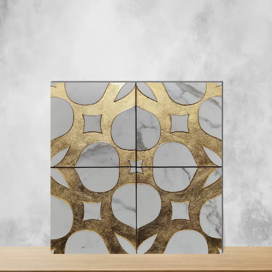 Details: Metallic vitrified wall tile 'Arte' measuring 197 mm x 197 mm (8x8 inch) with a 9 mm thickness. Handcrafted precious-metal finish in Gold on a durable vitrified base. Square wall tile designed for indoor use and for installation in dry areas; supplied as 1 piece per pack. Ideal for both residential and commercial interiors, offering a premium metallic look with low porosity and long-lasting performance. Highlights: - Handcrafted precious-metal metallic finish in Gold - Size: 197 x 197 mm (8x8 inch); Thickness: 9 mm - Vitrified base for strength, durability and low water absorption - Square shape and specifically designed for wall applications - Suitable for residential & commercial indoor settings; pack of 1 piece Usecases: - Feature and accent walls in living rooms and bedrooms - Decorative wall panels in kitchens and dining areas (dry zones) - Office interiors and reception walls for a premium metallic look - Bathroom walls in dry areas or zones where low moisture exposure is expected