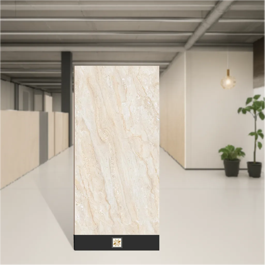 Beige Sheltar vitrified floor & wall tile in a large 4x2 feet (1200 x 600 mm) format with 9 mm thickness. The tile offers a realistic marble look and a high-gloss finish that reflects light for an upscale appearance. Its vitrified body delivers long-lasting durability, stain resistance and protection against moisture. Packaged as 2 pieces per pack and available in 4 random designs, this indoor tile is designed for both residential and commercial use while remaining a budget-friendly, value-for-money choice.