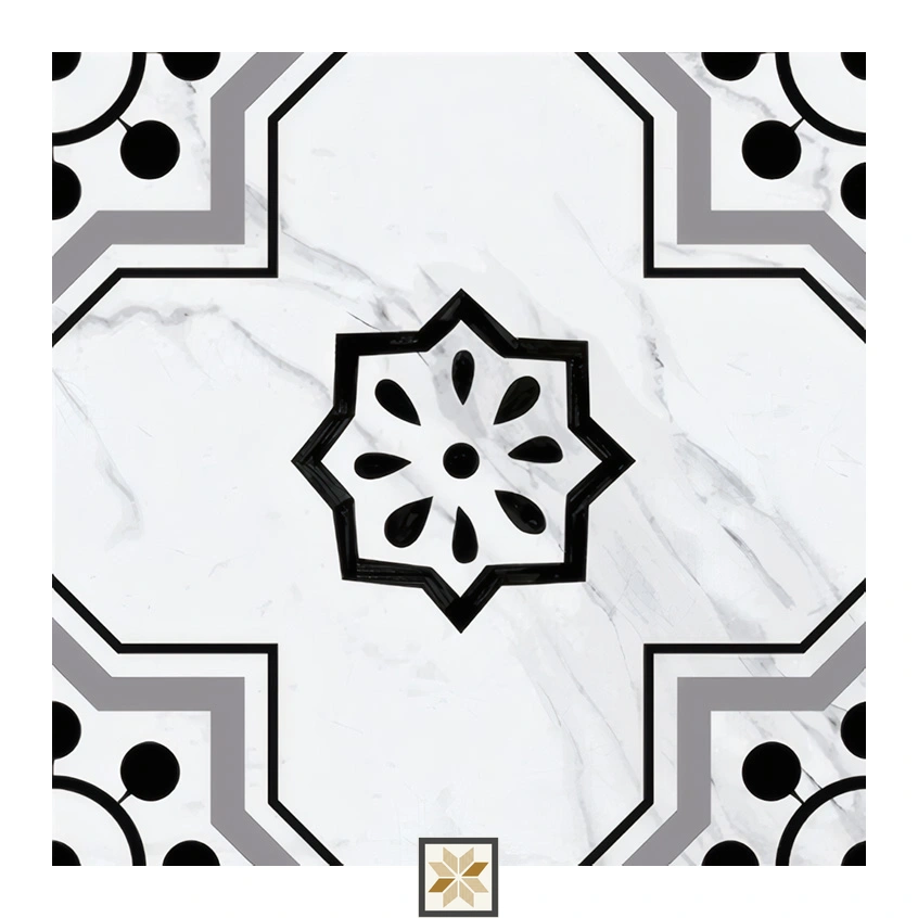 The Monochrome Marbello from the Morissa series is a Moroccan-inspired 12x12 inch (1ft x 1ft) square ceramic tile with a vitrified ceramic body and an 8 mm thickness. Its matte, low-sheen surface showcases geometric monochrome patterns that bring an exotic, designer look without gloss. Finished in black tones and built for indoor use, these durable floor & wall tiles are water-resistant, anti-slip and UV-stable, making them suitable for both residential and commercial projects. Supplied in packs of 8 pieces for convenient installation and pattern planning.