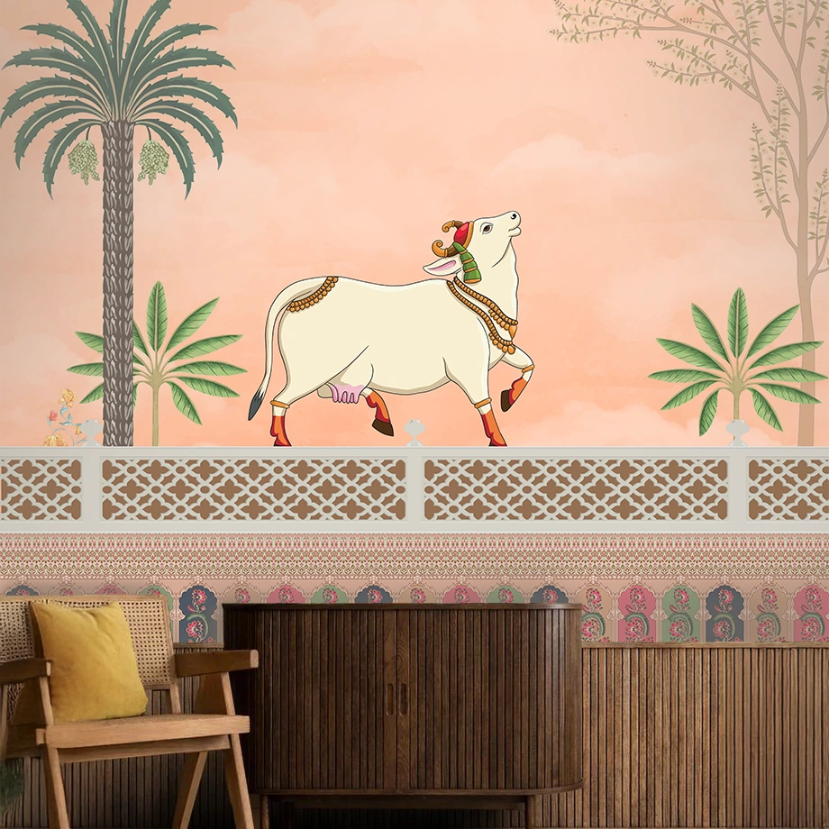 A sophisticated Beige Traditional Kashmiri Embroidered Style wallpaper featuring Pichwai-inspired animal print motifs and a refined matte look. This premium, non-woven (PVC-free) wallcovering uses WP01MTF paper at 150 GSM for a durable, breathable, tear-resistant finish that suits both residential and boutique commercial interiors. Available in customized sizes to ensure a precise fit for accent walls in living rooms, bedrooms, dining rooms and kid’s rooms. The product installs easily with the paste-the-wall method for neat application and straightforward removal. Note: design change not possible. Minimum order quantity: 30 Sq. Ft.
