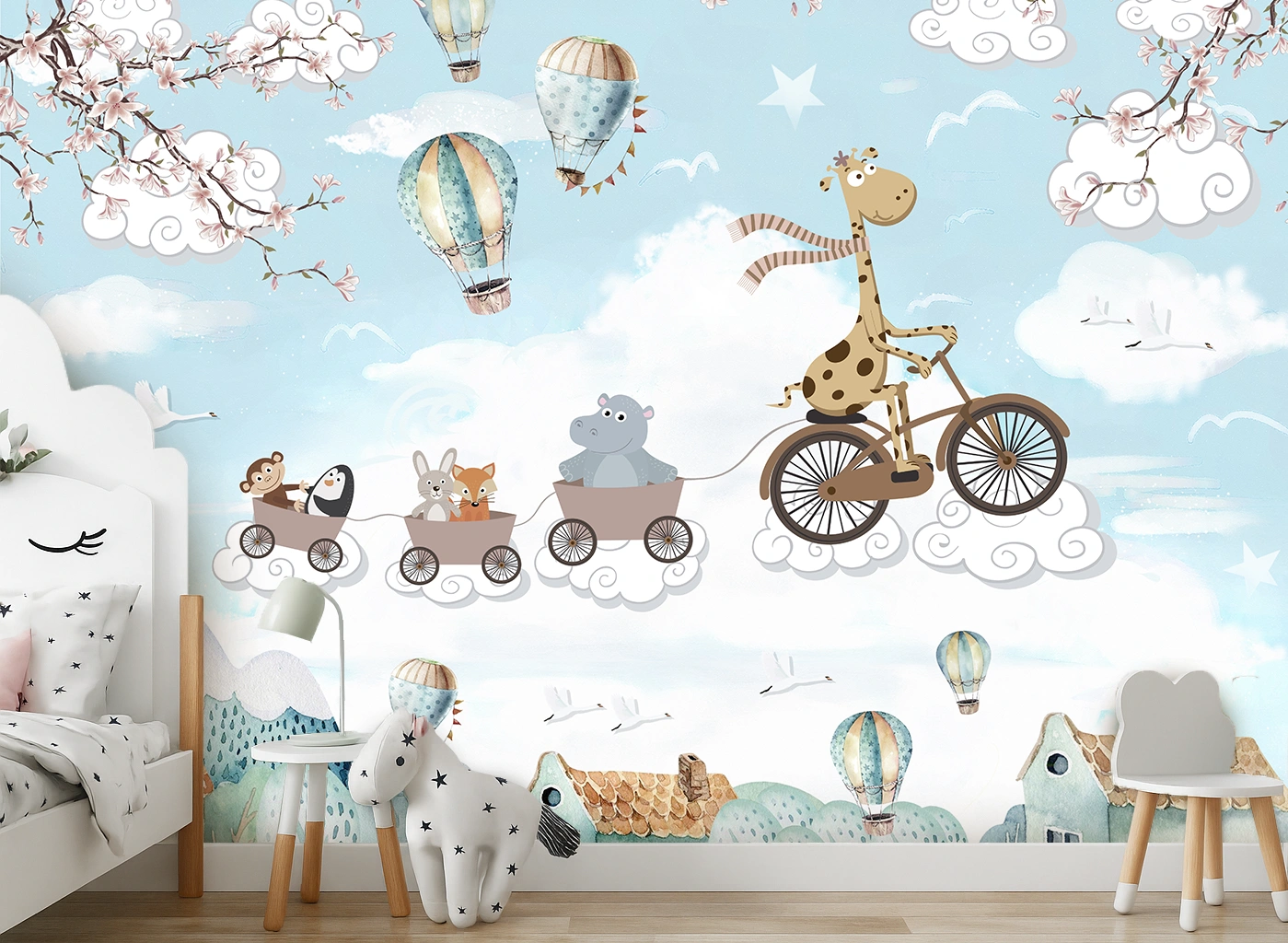 Details: Bring artistic charm to your interiors with the Blue Animals Riding In City Illustration Kids Room Wallpaper. This premium, PVC-free Non Woven wallpaper showcases delicate city-and-animal motifs in soothing blue tones and an animal-print look, designed to enrich accent walls in kids' rooms, living rooms, bedrooms, dining areas and boutique commercial spaces. The WP01MTF paper at 150 GSM delivers a smooth matte finish with a durable, breathable and tear-resistant base. Each roll is custom-sized to your wall dimensions (MOQ = 30 Sq. Ft.) for a seamless fit. Installation is straightforward using the paste-the-wall method for neat application and easy removal. Note: design change not possible. Highlights: - Design: Blue Animals Riding In City Illustration with premium animal-print styling - Material: PVC-free Non Woven base for breathability and long-lasting performance - Paper: WP01MTF, 150 GSM for a smooth matte, premium appearance - Size: Customized to fit your wall dimensions (MOQ = 30 Sq. Ft.) - Finish: Matte, low-glare surface ideal for accent walls - Installation: Easy paste-the-wall method; clean application and removal - Applications: Perfect for Kid's Room, Bedroom, Living Room, Dining Room; suitable for residential & commercial projects